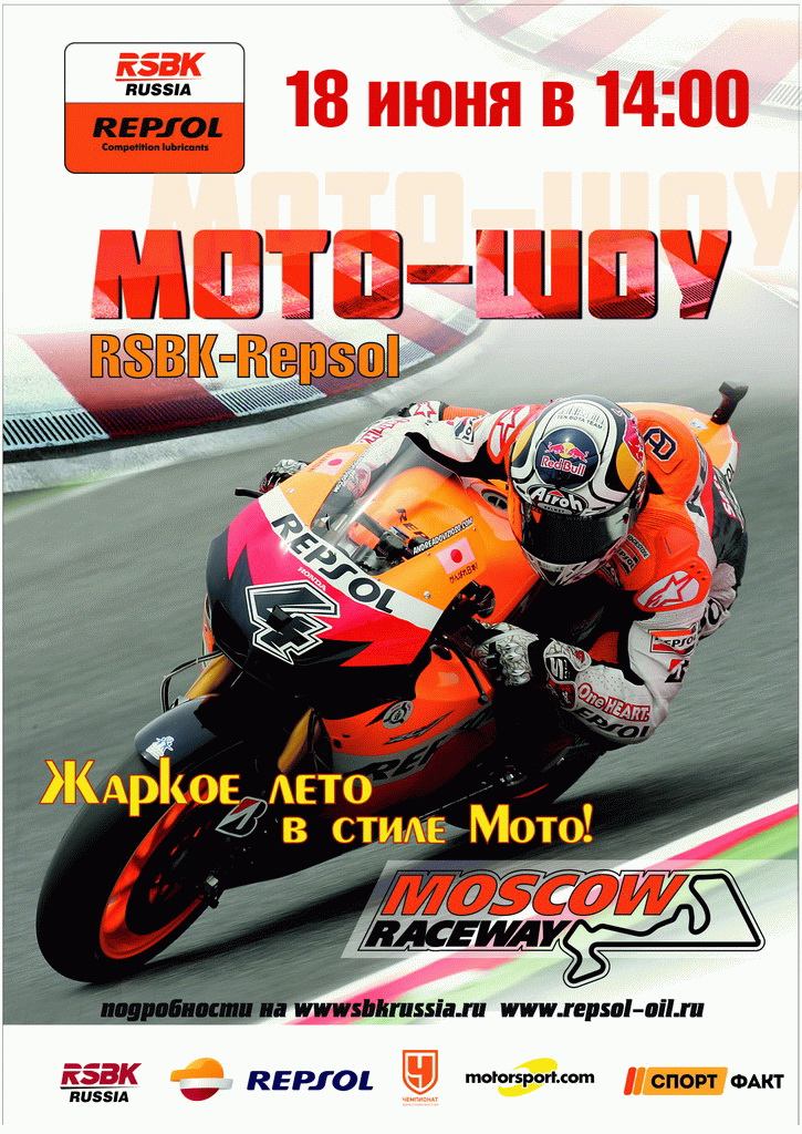 18 июня на треке Moscow Raceway под Волоколамском пройдут международные соревнования по мотогонкам: второй этап сезона RSBK-REPSOL 2016. За звание лучшего пилота второго этапа RSBK- REPSOL будут бороться более 80 мотогонщиков из разных городов России и стран СНГ. Но особое внимание, конечно же, будет приковано к пилотам и командам из Москвы, для которых подмосковная трасса Moscow Raceway является домашней. Жесткая битва мотогонщиков за титулы состоится в основных и самых зрелищных классах «Superbike» и «Supersport», так же зрители смогут наблюдать интригующую борьбу в под классах «Superbike EVO» и «Superbike EVO 2», “Supersport EVO» и «Supersport EVO 2». Стоит уточнить, что интерес болельщиков к российским шоссейно-кольцевым мотогонкам значительно повысился вместе с появлением подклассов EVO.В совмещенных классах STK 1000/600 ожидается не менее горячая схватка, а в любительском классе StockOpen, поедут те, кто решил поменять опасные гонки на дорогах на полотно профессионального трека и стать кандидатами на переход в профессиональный мотоспорт. Женский зачет RSBK- Repsol каждый раз становится украшением этапа и заслуживает отдельного внимания. Девушки-пилоты соревнуются на равных с мужчинами и успешно занимают призовые места! Безусловно, 18 июня станет волнующей датой для всех поклонников мотогонок. Кто же из пилотов в этот раз одержит победу и получит высокое звание чемпиона RSBK- Repsol второго этапа? Приготовьтесь болеть за звезд российского супербайка, ощутите адреналин, спортивный азарт и радость борьбы вместе с ними! В этом году RSBK отмечает свой пятилетний юбилей, поэтому программа московского этапа чемпионата будет яркой и грандиозной! Организаторы приглашают всех зрителей отметить этот праздник спорта, экстрима и адреналина! Помимо гоночных заездов, гостей мероприятия ожидает мотошоу от звезд российского супербайка, автограф-сессии с победителями, и множество сюрпризов, о которых вы узнаете непосредственно на треке! Помимо мотобитвы среди пилотов высочайшего класса, для посетителей будут организованны дополнительные развлечения в паддоке: -показательные выступления по мото-триалу -тест-драйвы мотоциклов и квадроциклов - площадка с минимото, где любой желающий сможет попробовать прокатиться на этом мотоцикле. Для самых маленьких посетителей уже по доброй сложившейся традиции будет организована специальная надувная площадка, где будет проведена специальная гонка на беговелах под присмотром опытных инструкторов для детей от 2-х до 6 лет С каждым годом число пилотов RSBK увеличивается, а сам чемпионат переходит на качественно новый уровень. Лучшее тому подтверждение – сотрудничество с испанской нефтегазовой компанией Repsol, под эгидой которой пройдут все этапы сезона RSBK 2016! Repsol входит в 10-ку крупнейших нефтегазовых концернов мира, одним из направлений деятельности которого является производство высококачественных смазочных материалов для автомобилей, мотоциклов, строительной техники, индустриальных машин и механизмов, а так же авто и мото спорта. В предстоящем сезоне компания Repsol приготовила умопомрачительный подарок поклонникам мотоспорта! На Чемпионата RSBK представители Repsol разыграют VIP- приглашение в Испанию на MOTO GP! Все желающие могут принять участие в конкурсе. Победитель отправится на 18-й этап мирового чемпионата Moto GP (Гран –при Валенсии), который состоится в Испании 13 ноября 2016 г
